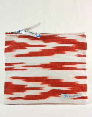 Clutch pequeño de tela mallorquina pintada a mano, en color rojo y blanco. Composición: 70% algodón y 30% lino.