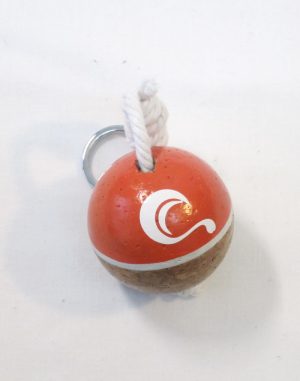 Llavero en forma de boya de corcho pintada a mano de color naranja.