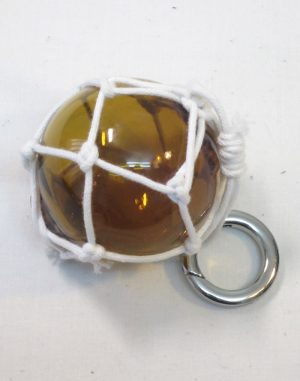 Pendant in the shape of yellow glass buoy with a hand-woven cotton net around it.