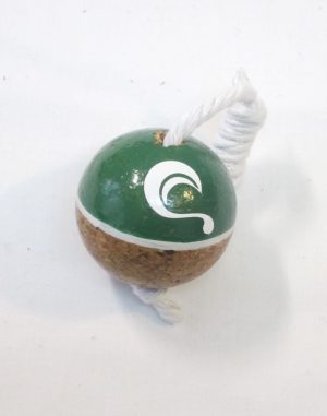 Llavero en forma de boya de corcho pintada a mano de color verde.